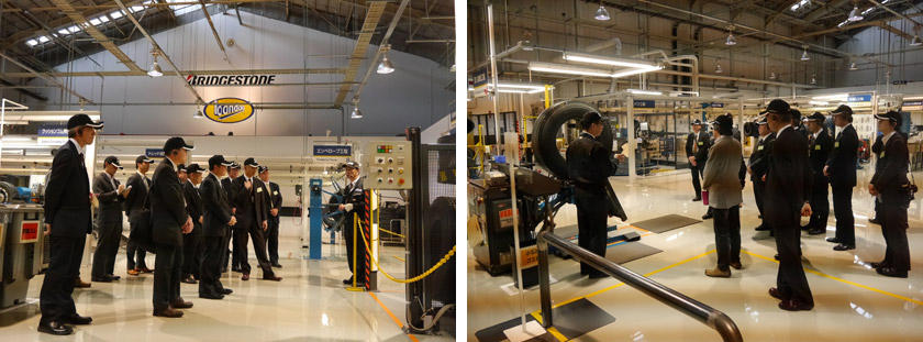 説明会後は、来場者の皆様に弊社技術センターの一部をご見学頂きました。商品の性能確認や安全性のチェックを行う試験設備と、バス用タイヤを語る上では欠かすことのできないリトレッドタイヤ生産工程の見学です。