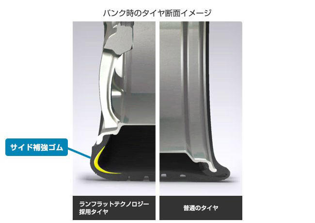 ランフラットテクノロジー採用タイヤとは、パンクしても所定のスピードで一定の距離を走ることができるタイヤです。