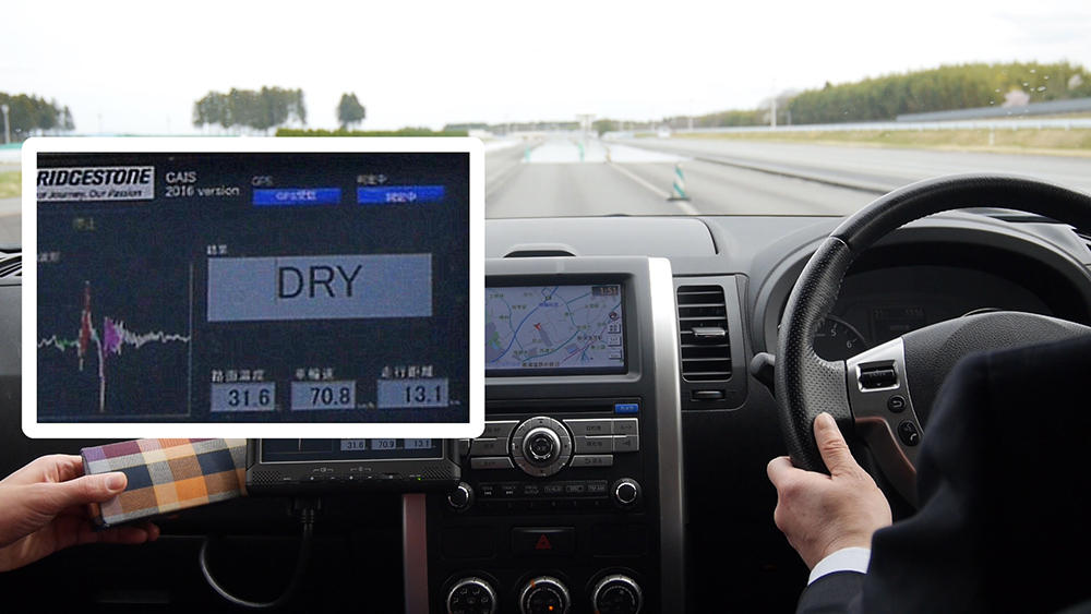 CAISを装着した車で乾いた路面から濡れた路面に入っていきます。この時CAISが路面の状態を判別し、車の中にあるこのモニターに路面の状態(DRY、WETなど)が表示されるようになっています。将来的には、CAISで集めた情報を用いて、ドライバーへの安全運転支援や自動運転などのシステムの向上に役立てることができると考えています。
