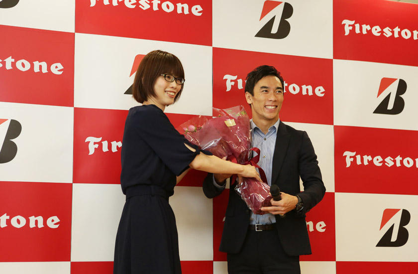 まずはF1で活躍する佐藤選手がきっかけでブリヂストンに入った大ファンの社員から、インディ500優勝を祝して花束を贈呈。