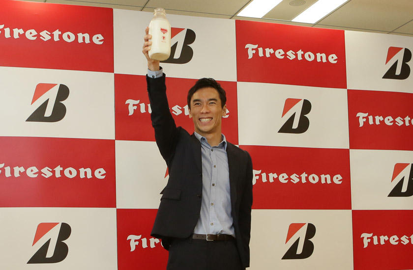 インディ500では、毎年優勝ドライバーが表彰台の上で牛乳を飲むという独特の慣習があり、今回優勝を果たした佐藤選手も、レース後には頭から牛乳を浴びて盛大にお祝い!インディ500で優勝してから嫌というほど牛乳を飲まされたであろう佐藤選手ですが、今日もおいしそうに勝利の牛乳を味わい「ブリヂストンファミリーとして、インディ500で優勝することができて本当に嬉しいです。たくさんの応援ありがとうございました」とブリヂストン関係者に嬉しいメッセージをいただきました。