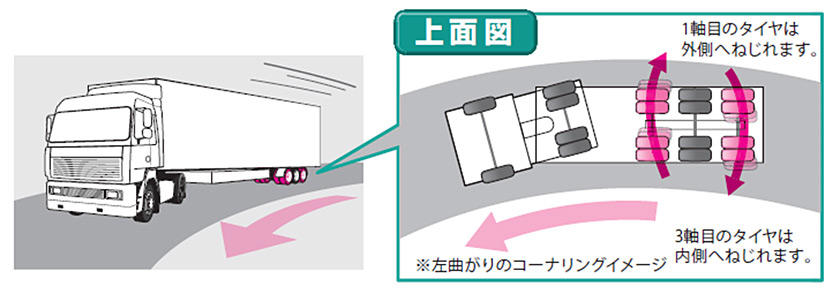 3軸トレーラ(下図のような車両)は、旋回時に後輪部分の1軸目と3軸目にかかるサイドフォース(ねじれ入力)が