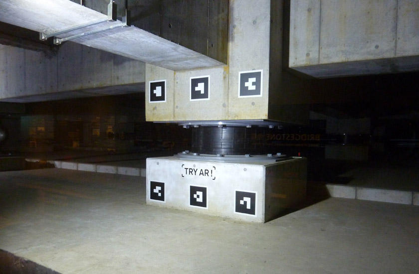 地下では「ブリヂストンTODAY」が入っている技術センターの建物に使われている免震ゴムをご覧いただけます。拡張現実(AR)で地震が発生した際に免震ゴムがどのように機能するかもご覧いただけます。Let’s TRY AR!