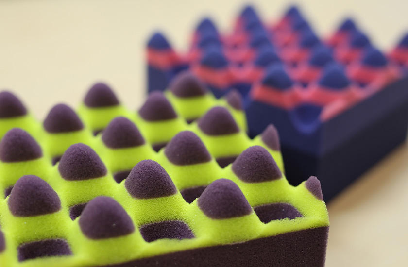 西川産業の睡眠研究所では以前から寝姿勢や体圧分散性を重視した形状や素材の研究を続けてきましたが、現行製品であるエアー03の立ち上げにあたりブリヂストンとともにさらに一歩進んだ技術開発を行いました。そして反発弾性が高く、耐久性があり、体圧分散性に優れ、かつ軽量である「ソムニフォーム」という高性能材料を誕生させました。特徴的な凹凸のひとつひとつに実はブリヂストンの先進技術が凝縮されているのです。