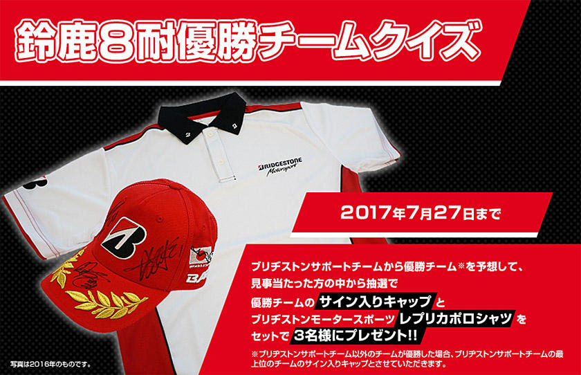 鈴鹿8耐に参戦しているブリヂストンのサポートチームの中から、優勝チームを予想頂き、見事予想が当った方の中から抽選で「優勝チームのサイン入りキャップ」と「ブリヂストンモータースポーツ レプリカポロシャツ」のセットを3名様にプレゼントいたします。