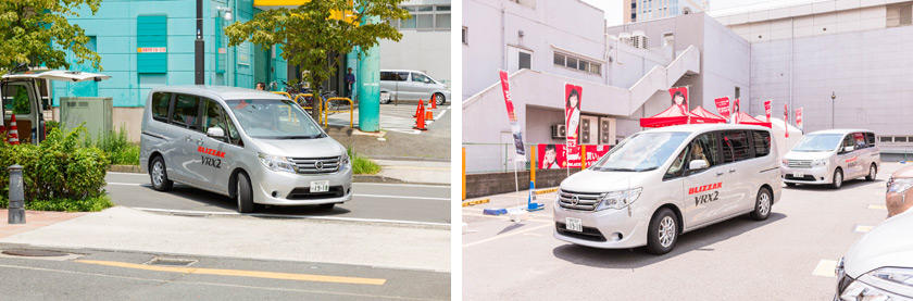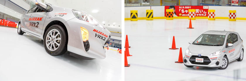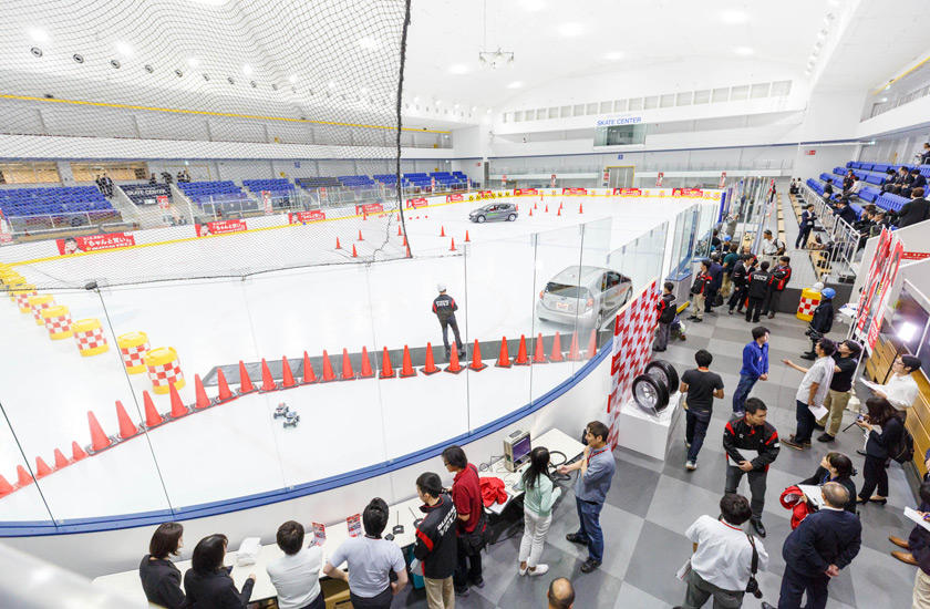 ここでは、一般のお客様に夏タイヤと冬タイヤ(スタッドレスタイヤ)の氷の上での違いを体感していただくため、スケートリンクでご試乗をしてもらいました。