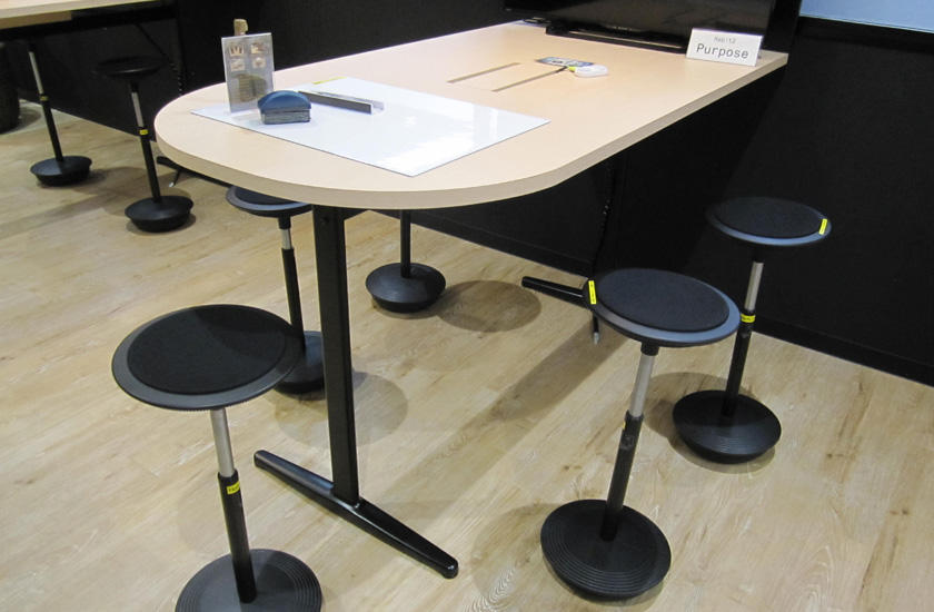 ミーティングスペースの一角にある不安定な椅子。腰かける部分の面積も狭く、15分も座っているとお尻が痛くなってしまうため、自然と「終わりを思い描いてから」ミーティングを始めることができます。