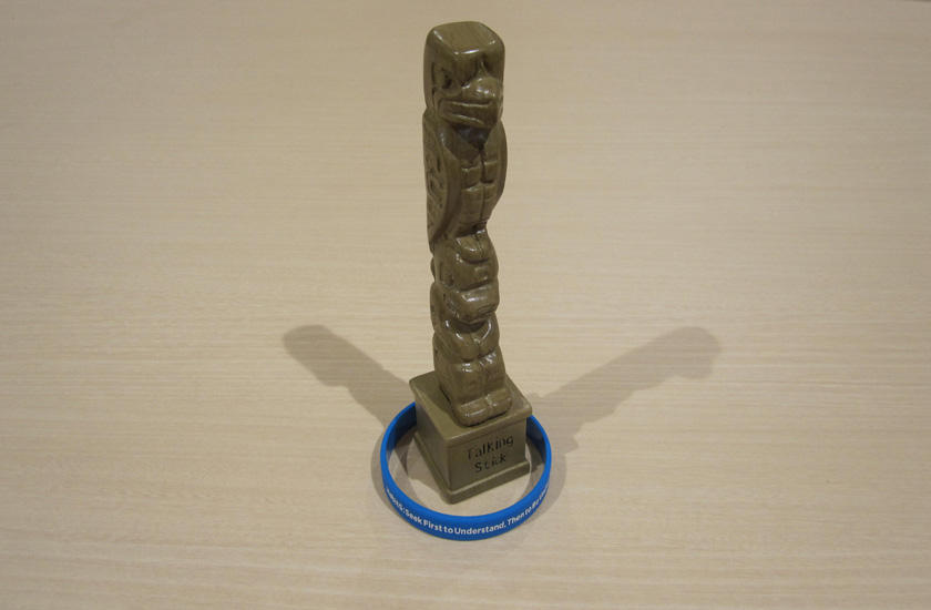 各テーブルには、第5の習慣「まず理解に徹し、そして理解される」を表すトーキングスティックが置いてあります。「トーキングスティックを持っている人だけが話し、それ以外の人は相手の話を集中して聴く」ことを意味しています。