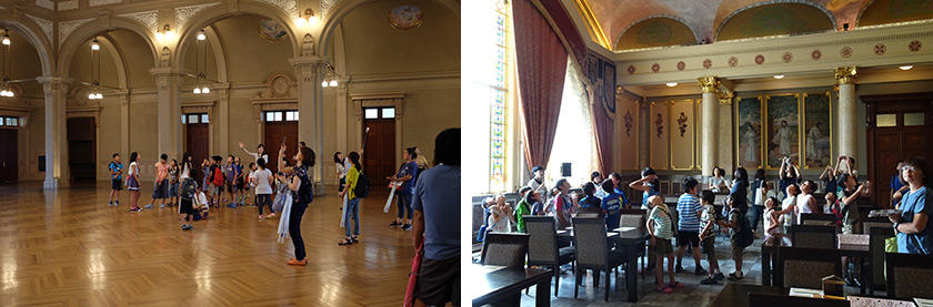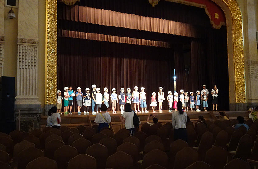 公会堂で働く隊長を先頭に、隊員たちは公会堂の舞台に集合し、探検をスタート。各部屋のステンドグラス、シャンデリア、さらには階段や扉のデザインにまで、建築の粋を尽くした公会堂の美しさに圧倒されていました。