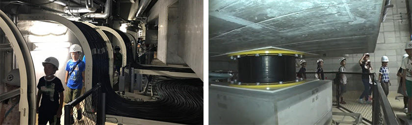 そしてとうとう免震ゴムがあるひみつの地下室に潜入。地下室とは、免震ピットと呼ばれる免震ゴムが設置されている層のことで、普段は入れない場所です。そこにヘルメットをかぶって入り、本物の免震ゴムを発見。その大きさと力強さを実感し、設置されている免震ゴム1つ1つが地震の揺れを吸収し、建物を守っていることも学びました。