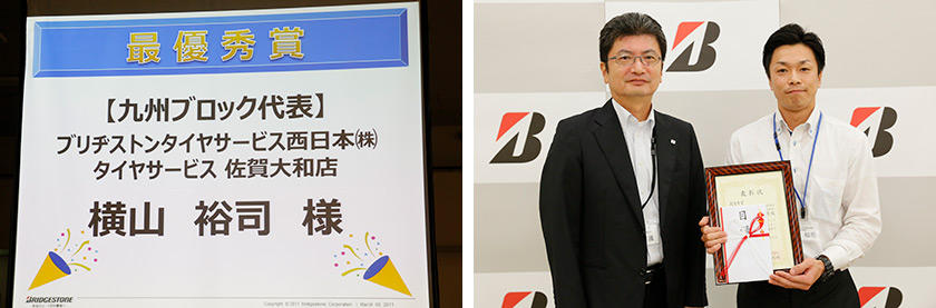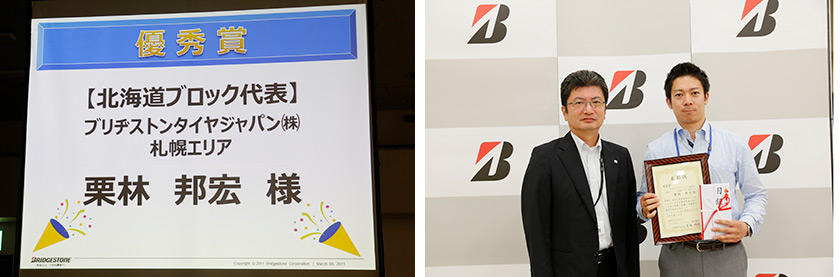 ※(写真右):右がセールスマンコンテスト優秀賞の杵渕さん見事、全参加者169名の頂点である最優秀賞を勝ち取ったのは、ブリヂストンタイヤサービス西日本株式会社 タイヤサービス佐賀大和店の横山 裕司さんです!