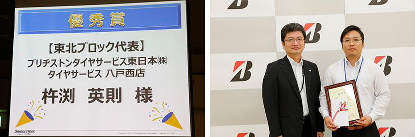 ※(写真右):左からブリヂストンタイヤジャパン㈱ 中道専務、セールスマンコンテスト優秀賞の栗林さん●ブリヂストンタイヤサービス東日本株式会社 タイヤサービス 八戸西店 杵渕 英則さん
