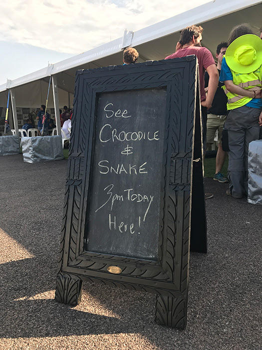 また、ブリヂストンは、参加チームや来場者がリラックスして楽しめる場として「Bridgestone HUB」を設置しています。この日はダーウィンの名物、クロコダイルとヘビがブースを訪れました。