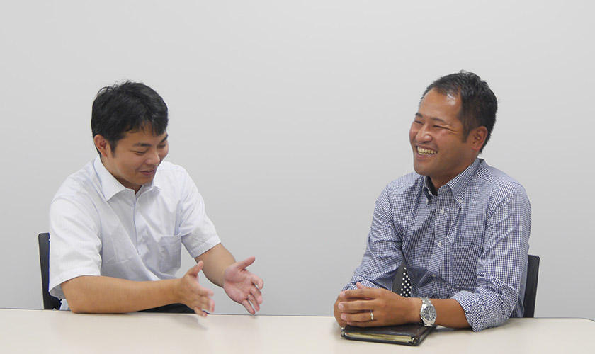 吉角 結果は、意外なところで出てきたよね。お客様主催の展示会でブースを出したとき、ユーザーさんが「メーカーならこれぐらい知ってないと」とお怒りになって。虎尾はその方が納得するまで、30分ぐらい懸命に応対してた。するとそれを見ていた主催のお客様が「根性あるな」と虎尾を気に入り、注文を増やしてくださった。不器用だけど折れない虎尾の姿が、お客様の心をつかんだということ。営業マン虎尾の可能性を感じた出来事だったな。