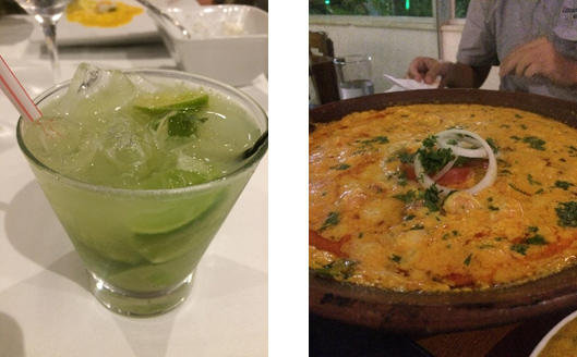 (左)カイピリーニャ/(右)海老のムケッカ(2人前)バイーア地方の代表的な郷土料理の一つ、ムケッカ。少し癖がありますが、ブラジル伝統のカクテル、カイピリーニャと一緒にいただくと一気にブラジルの世界に引き込まれます。飲みすぎに注意です。