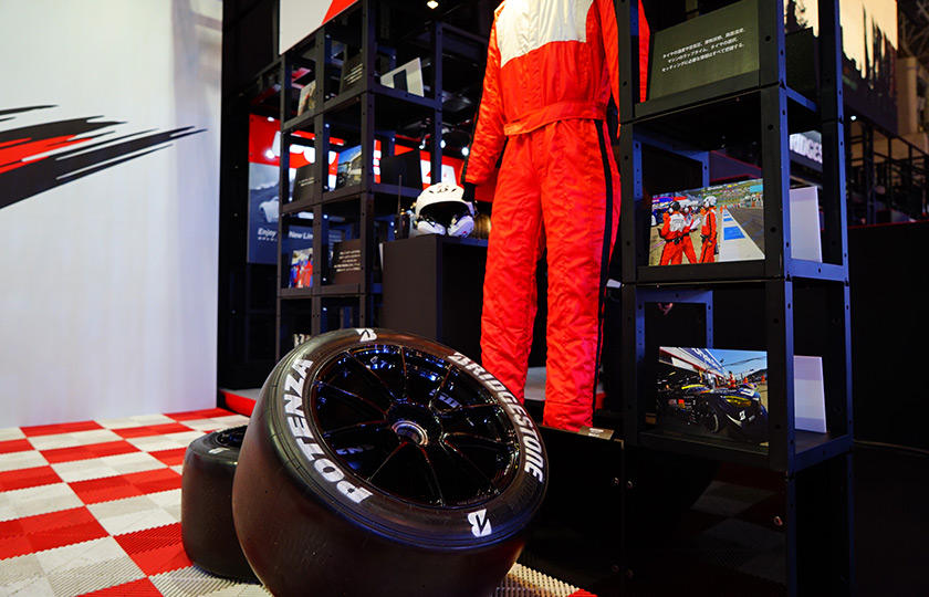 モータースポーツコーナーでは、モータースポーツを支える「POTENZA RACING TIRE」やサーキットでタイヤエンジニアが身につけているファイアースーツや無線キットなどが飾られています。