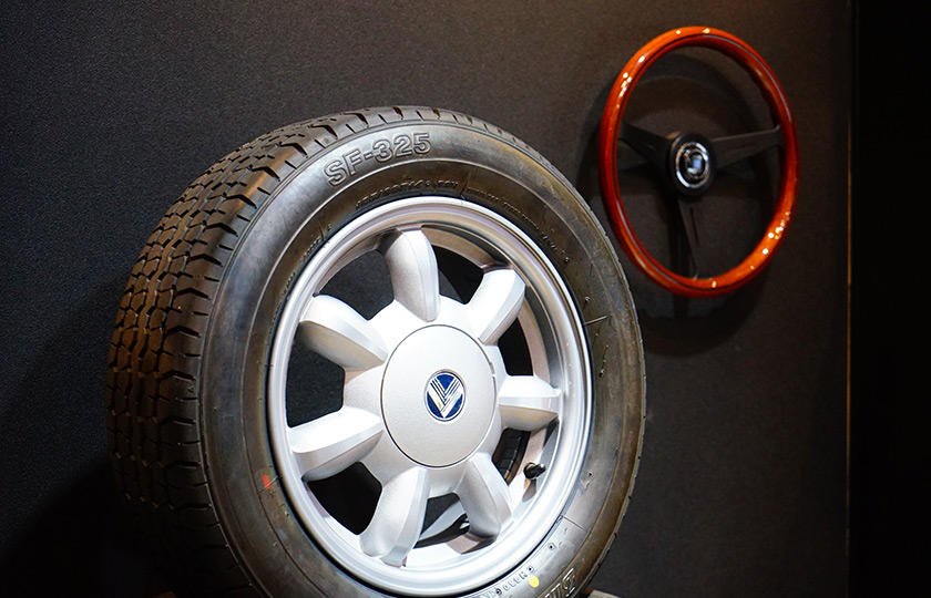 マツダさんのブースでは、初代ロードスターの新車装着タイヤ「SF325」の復刻タイヤを展示中です。当時開発を担当していたマツダさんとブリヂストンのエンジニアが力を合わせて、レストア用に蘇らせたタイヤです。