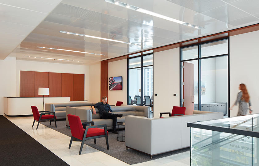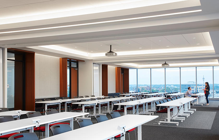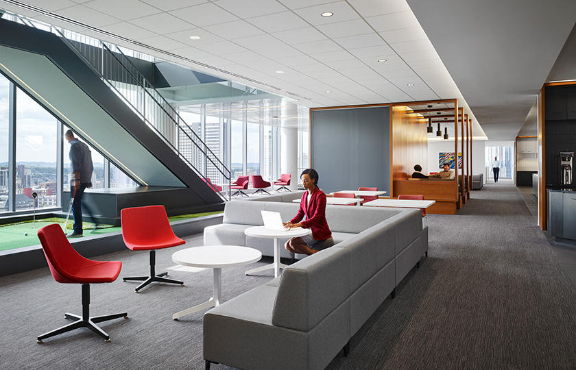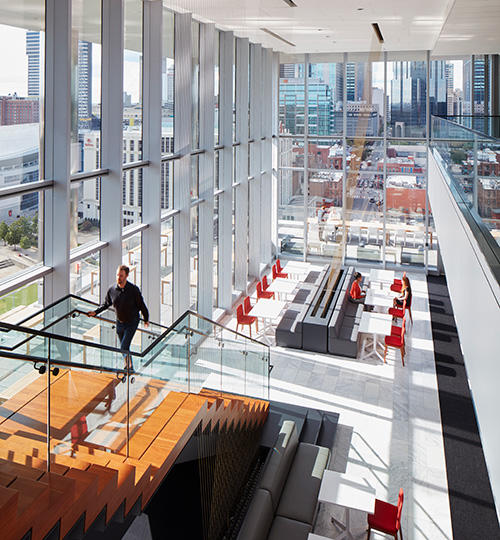一般的なオフィスビルでは会議室を窓側に配することが多いのですが、この建物では全てのフロアともに会議室を建物の中心に置き、ワークスペース全体に屋外の光が入るようになっています。これにより心地よい職場環境の実現と省エネを両立しているのです。ナッシュビルの町を一望できるテラスもあります。