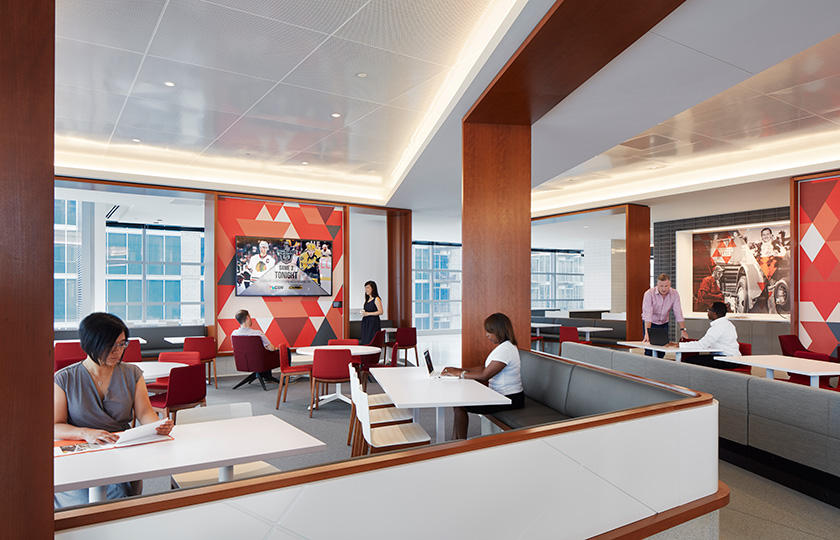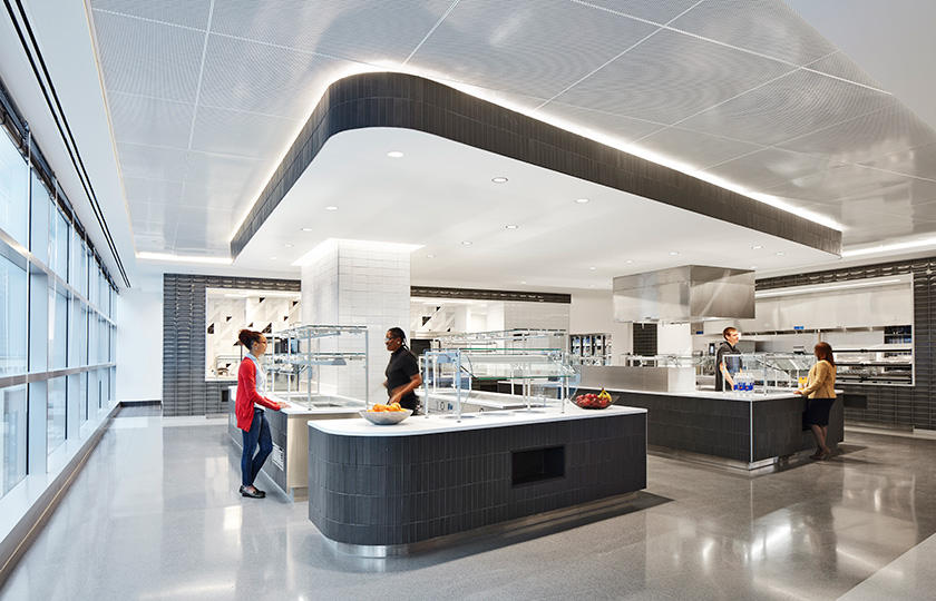 14階の奥にはフィットネスセンター、そして社員食堂にあたるレストランがあります。朝早くから働くアメリカのワークスタイルに合わせ朝食も提供しています。ランチタイムには寿司、パスタ、ハンバーガーなど世界各国の社員が集まる企業らしく、豊富なメニューを取り揃えています。