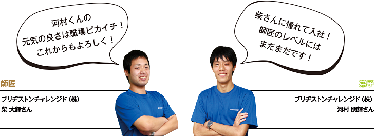 ブリヂストンで、先輩社員から後輩社員に伝わる一子相伝(?)の技術や考え方、お客様や仕事への思い。そこには、「師匠と弟子」の関係に似た、熱くドラマチック、でもなんだか身近な物語があります。このコーナーでは不定期にそういった「師匠と弟子」の様な人々の考え方などを紹介して行きます。ブリヂストンの内側が少し垣間見られるかも!?