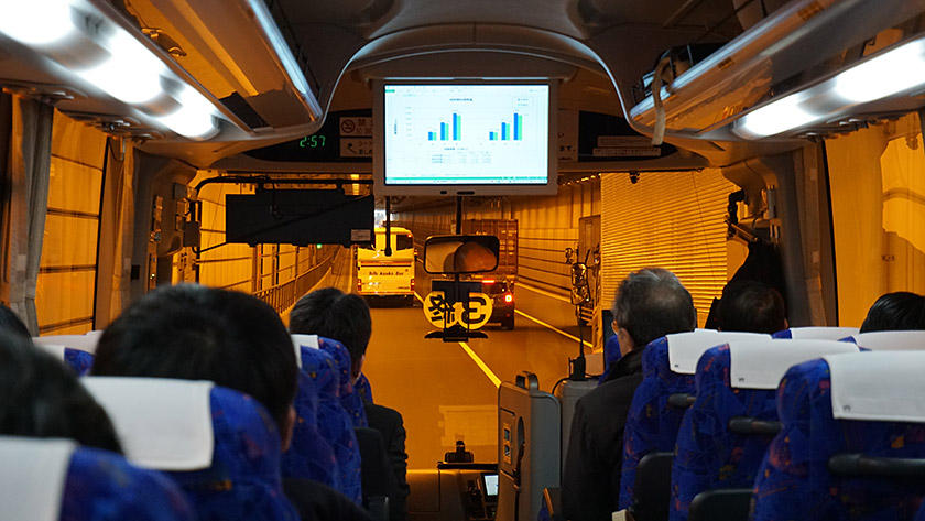 公開燃費テストは、ブリヂストンの低燃費タイヤECOPIA M801(エコピア エム ハチマルイチ)の燃費性能を実証するために行いました。時速70kmの一定速度で横風や渋滞の影響を受けにくい、「東京湾アクアライン浮島IC~海ほたるPA」間(往復12km)をECOPIA M801と通常タイヤで走行し、燃料の消費量を比較しました。事業者様は追跡用のバスに乗車頂き、試験車両の後方を走行頂きました。