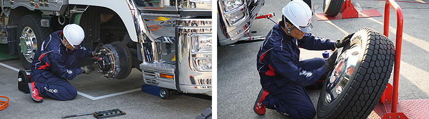 (左:ECOPIA M801、右:M800。見た目はそっくりなのに低燃費性能は違います!)燃費テストの後は、ブリヂストンの直営店でタイヤの安全作業のご紹介を行いました。 タイヤのメンテナンスは、トラックの安全運行確保においてとても重要です。ブリヂストンはタイヤメンテナンスを行うスタッフの人材育成にも力を入れており、どの店舗でも高品質で均一なメンテナンスサービスを提供することを意識しています。