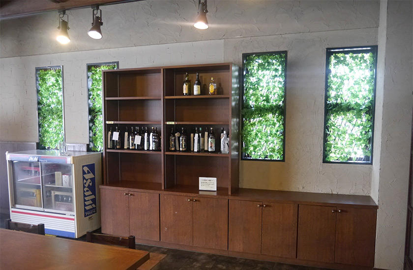 食事スペースの棚にはお客さんがキープしていると思われるお酒のボトルが並んでいました。 宴会用には飲み放題プランも用意されています。