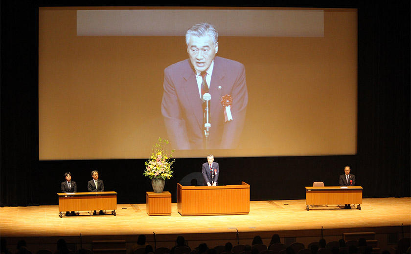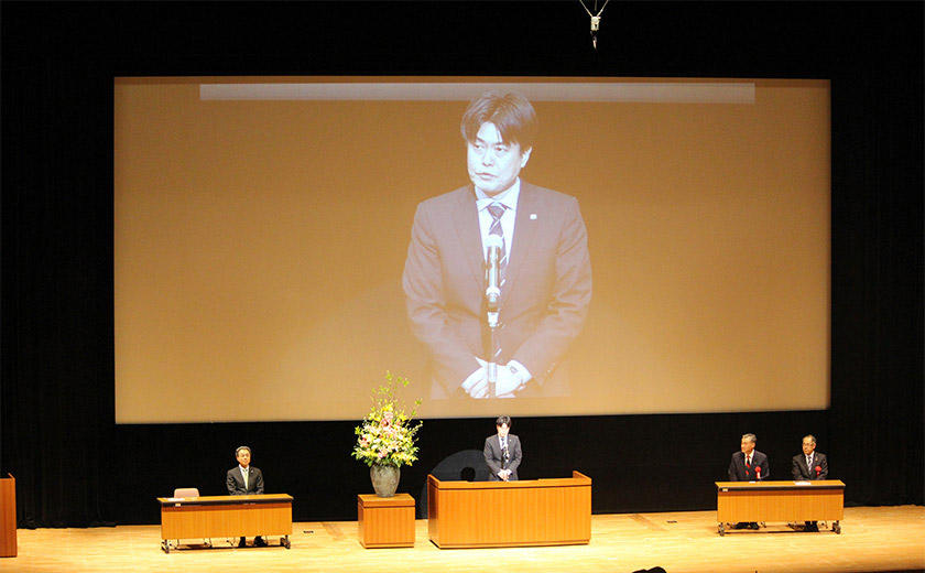 演奏に先立って、彦根市の大久保市長ご参加の下、彦根工場の操業50周年を記念したセレモニーを執り行い、井上工場長から市民の皆様への感謝と今後の更なる地域貢献への思いを述べました。