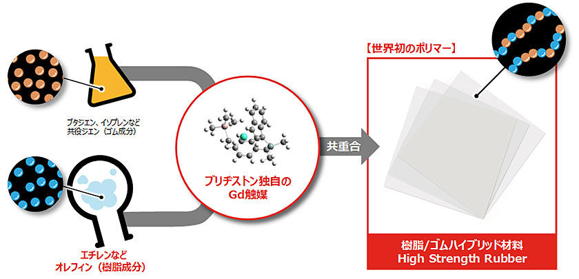従来、ゴムと樹脂を分子レベルで結び付けるのは極めて困難とされてきましたが、ブリヂストンが独自に開発した「ガドリニウム触媒」を用いることで、世界で初めてこれを実現しました。