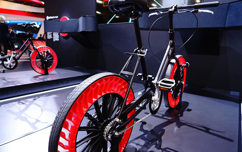 「エアフリーコンセプト」という空気を使わずに車重を支えるブリヂストンのタイヤ技術を採用したタイヤ。このタイヤを装着した自転車の走行シミュレーションを体験いただけます。