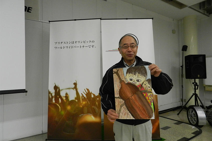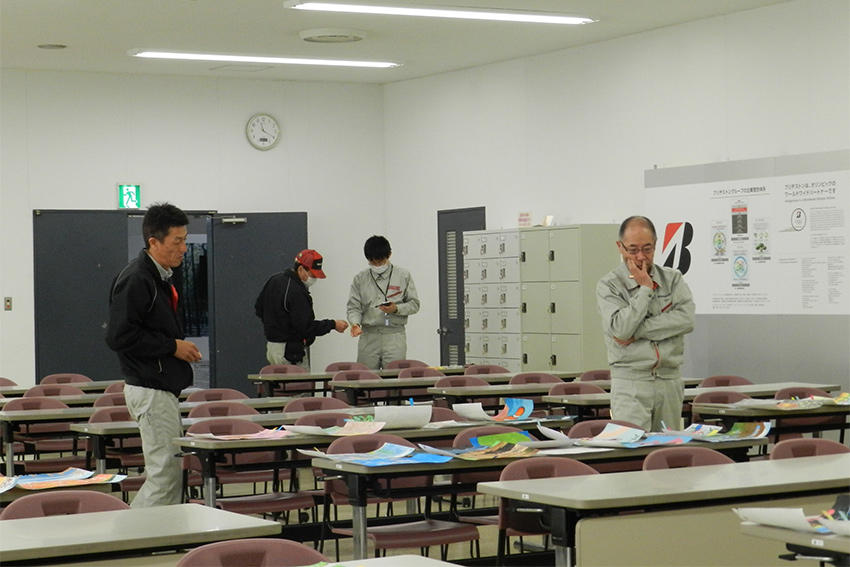 コンクールでは毎回、全国から数万点の作品が本社事務局に届き、受賞作品を決める全体審査が行われます。 その全体審査の前に、ブリヂストンの工場では日頃からお付き合いのある近隣小学校の作品を集め、工場独自の表彰を行っています。