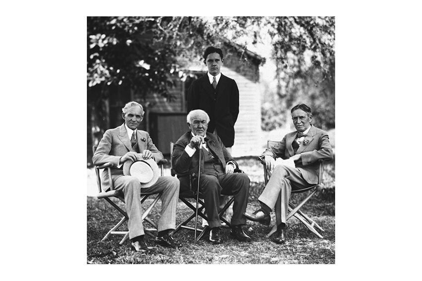<前列左より:ヘンリー・フォード、トーマス・エジソン、ハーベイ・ファイアストン>その先見性は、マーケティングの分野でも。モータースポーツを広告手法として取り入れたのは、ハーベイが世界初だったとも言われています。