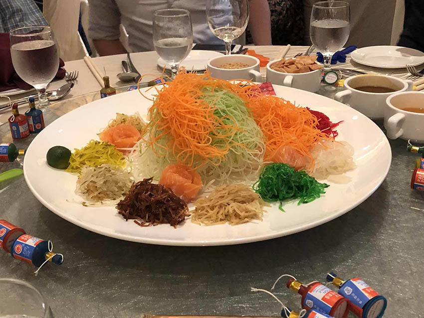 さらに、BSCAPでは毎年旧正月前に、日本でいう忘年会にあたり、殆どのスタッフが参加するChinese New Year Dinner(CNY Dinner)を催しています。毎年口火を切るのは、「シンガポールの旧正月といえばこれ!」と言っても差し支えない「魚生(ユーシェン)」。野菜と刺身、ワンタンの皮などの食材に胡麻やプラムソースを混ぜて頂く、シンガポールを代表する旧正月料理です。