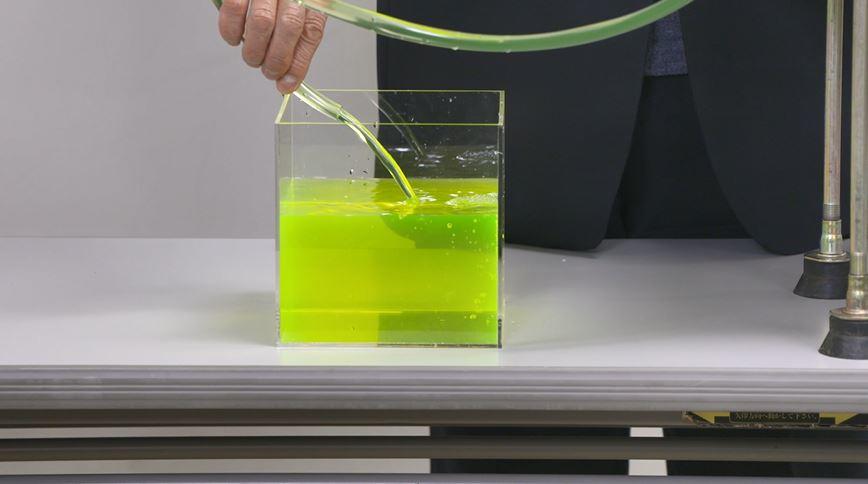 サイホンの原理についてご説明します。高い位置に水の入った容器、低い位置に空の容器を用意し、水で満たしたホースでつなぎます。すると水が高い方から低い方に流れます。この現象は高い位置にある容器と低い位置にある容器の水位が同じになるまで続きます。このサイホン原理を応用したのが「スマートサイホン」です。