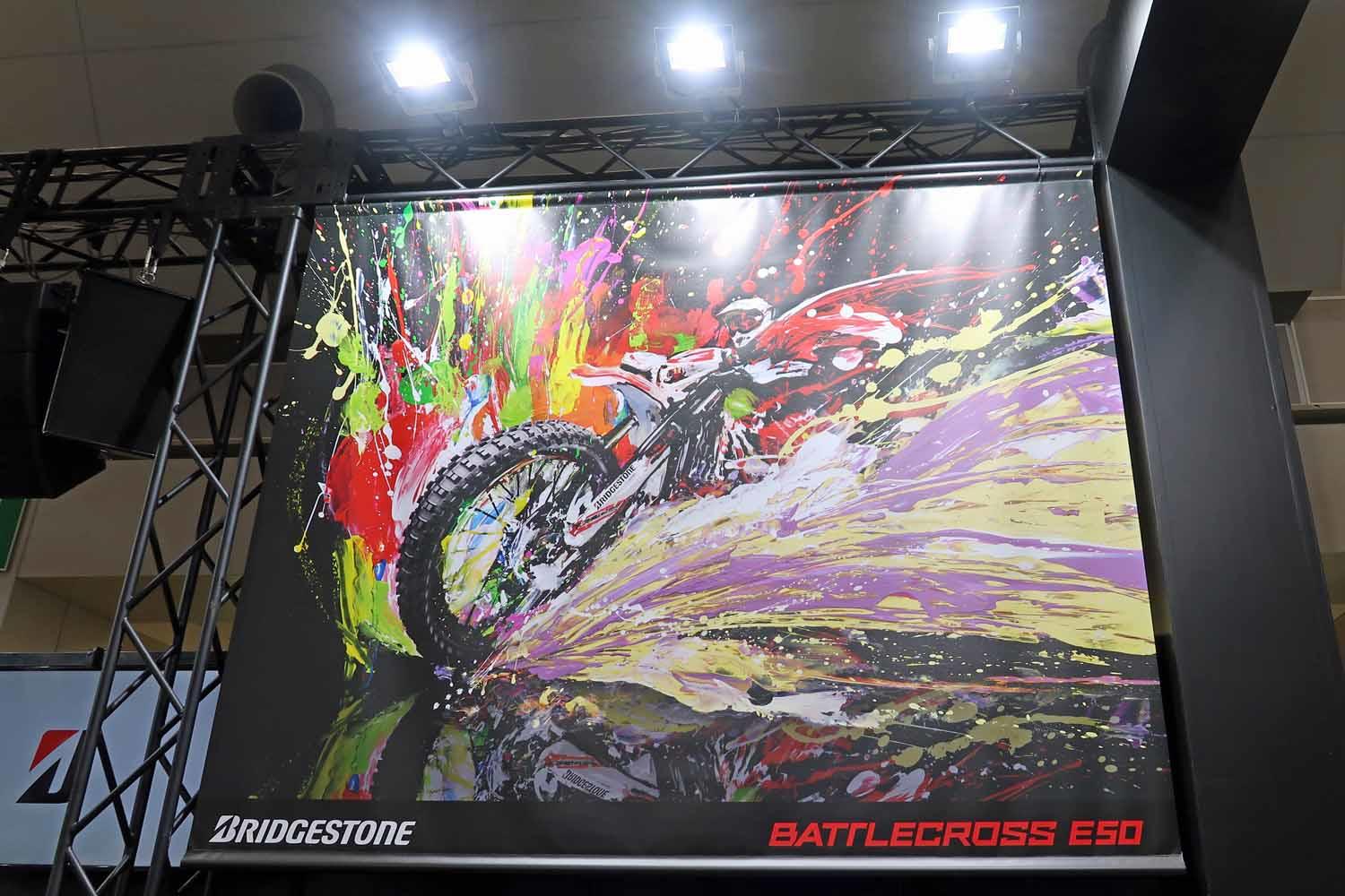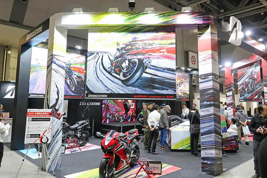今回のブリヂストンブースは、お客様のバイクライフを支える「BATTLAX(バトラックス) 」ブランドのタイヤ、そしてその走る「ワクワク」を、アートを用いてカラフルに表現しました。遠くからでも躍動感のある絵が目に飛び込んできます。