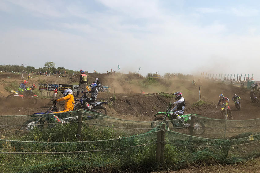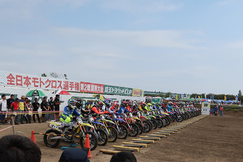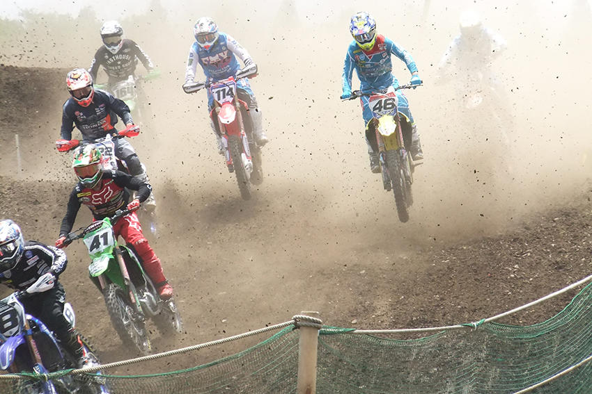モトクロスでは車両が横並びで一斉スタートします。スタート直後は土埃がすごいことに・・・