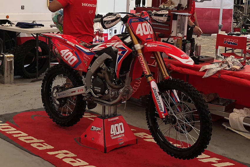 モトクロス専用車両は、通常のオートバイよりも背が高く、ジャンプなどの衝撃を吸収できるようサスペンションのストロークが長くなっており、また、同排気量の車両よりも車体が軽くなっています。写真の車両はホンダ「CRF450RW」です。