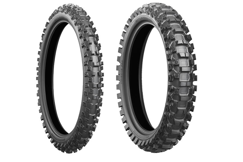タイヤは、しっかり路面に食い込み、さらに路面をかくことができるよう、ブロックタイヤが使用されます。路面の状態に対応した、ハード・ミディアム・ソフト・マッド用のタイヤパターンがあり、状況に応じて使い分けます。写真のタイヤはブリヂストンの「BATTLECROSS X20」です。