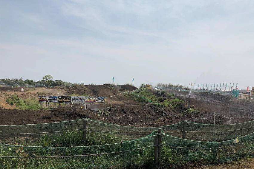 こちらが実際のコースです。この会場は、関東のオフロードで有名なオフロードビレッジ(埼玉県・川越市)です。この日は晴天に恵まれ、土埃対策のため散水がされています。