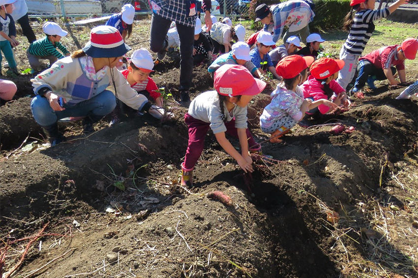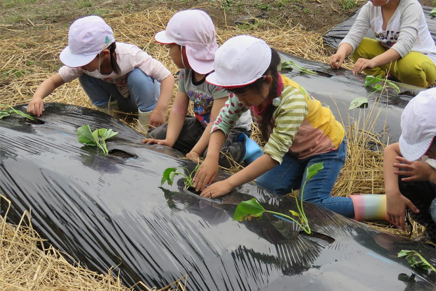 毎年5月頃には、那須工場の敷地内にある畑で、園児の皆さんによるサツマイモの苗植えが行われます。