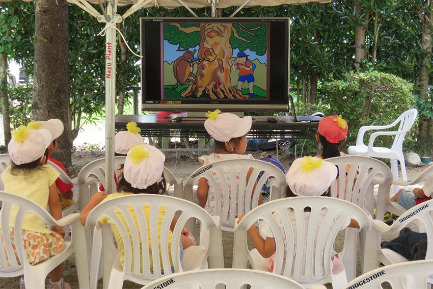 写真はデジタル式の紙芝居を用いて、カブトムシの成長過程を紹介している様子です。