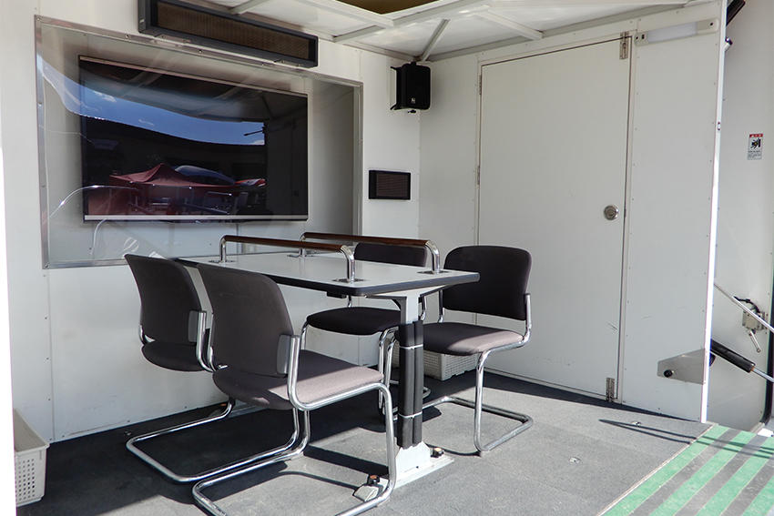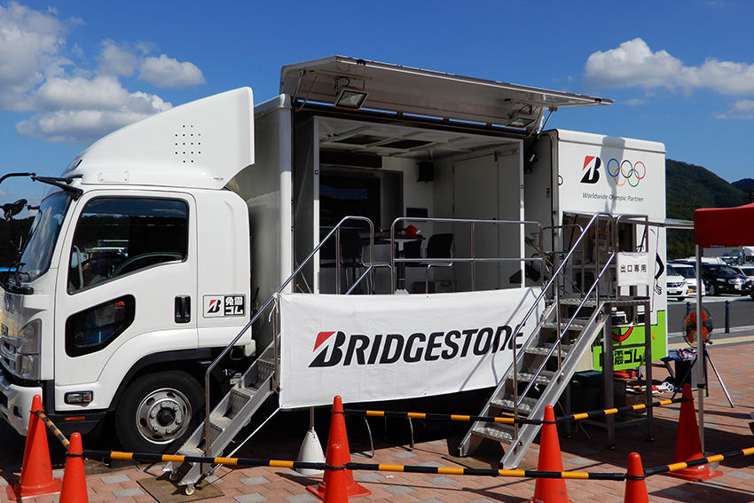 ブリヂストンでは地震の揺れを受け流して建物を守る「免震ゴム」を作っています。この免震体験車では、地震を受けた建物の揺れを再現し、免震ゴムの効果を体感いただきました。