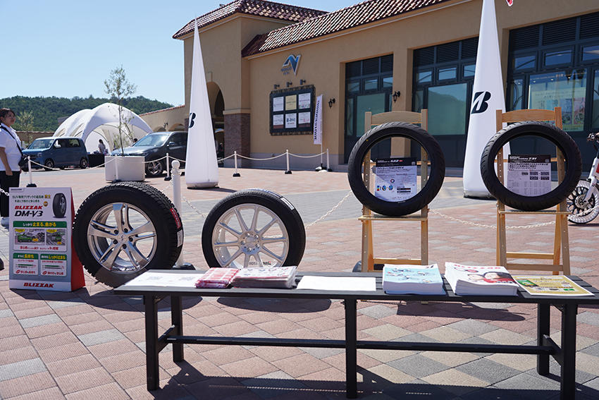 乗用車用タイヤとバイク用タイヤも展示