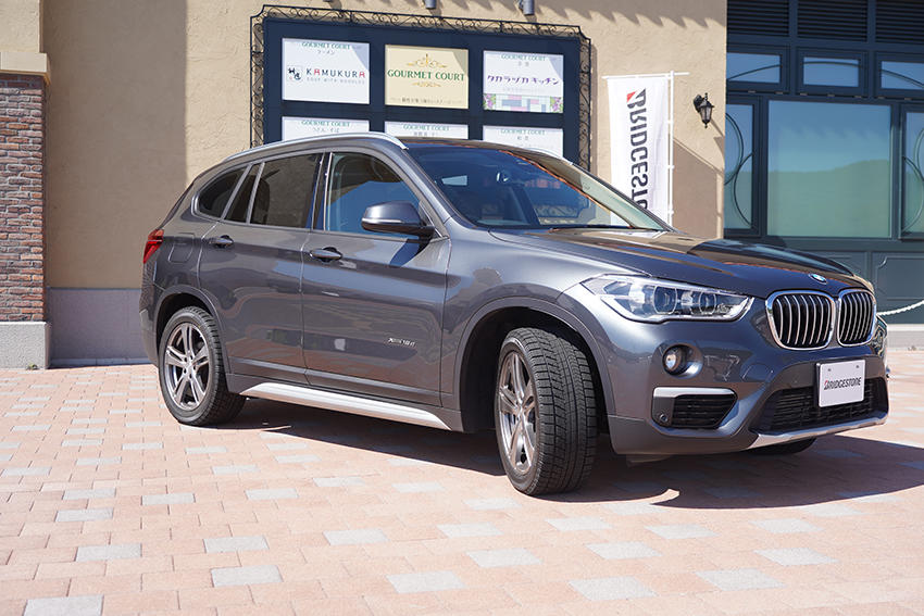 スタッドレスタイヤ「BLIZZAK RFT(ブリザック アールエフティ―)」を装着した「BMW X1」も展示!実はこのタイヤ、ランフラットテクノロジーを採用したタイヤで、パンクして空気圧がゼロになっても80km/hで80kmを走ることができる優れものです。