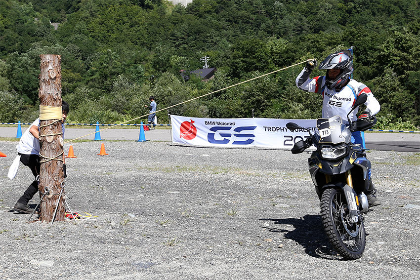 ブリヂストンの「BATTLAX ADVENTURECROSS AX41」は、他社の2銘柄とともに今年から、この「インターナショナルGSトロフィー」の国内選考会で使用可能なタイヤに指定されています。また今回の最終予選では、BMWが用意したF850GSを使用してイコールコンディションで競われるテストも多く、3台のうち1台には「BATTLAX ADVENTURECROSS AX41」が装着され、エントラントがテスト時に好みのタイヤを選択できる環境が整えられていました。写真は、スロットルを使わずクラッチだけでバイクを発進させ、低速旋回しながら木にロープを巻き付けられた長さを勝負する競技です。
