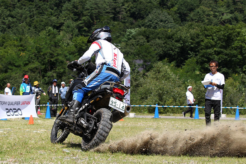 ちなみに国際大会となる本戦でも、国内予選と同じようにバラエティーに富んだテストが待ち構えています。過去にはカヌーレースやトラクター引き、バイクに乗ったままの槍投げなども……。バイクに乗る技術だけでなく、体力や他のスポーツに対する適応性、ルールを理解する能力やチームワークなど、まさに人間力が試される大会です。写真は、国内選考会最終テストのひとコマ。スタンディングでテールスライドしながらタイトターンするという課題です。「BATTLAX ADVENTURECROSS AX41」の優れたスライドコントロール性が活きます!