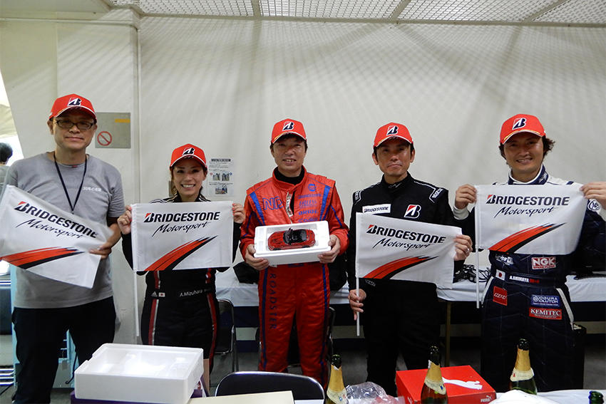レースは、「人馬一体」チームが1位をキープするも、終盤3台に抜かれて4位入賞。POTENZAシリーズの開発ドライバーでもある佐々木雅弘 選手が乗車する「ROOKIE RACING」チームが怒涛の追い上げを見せ、2位。優勝は、ピストン西沢 選手 率いる「J-wave Racing」チームが終盤先頭に立ち、そのままチェッカーを迎えました。上位6チームが同一周(180周)となる大激戦となりました。