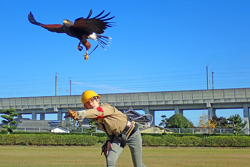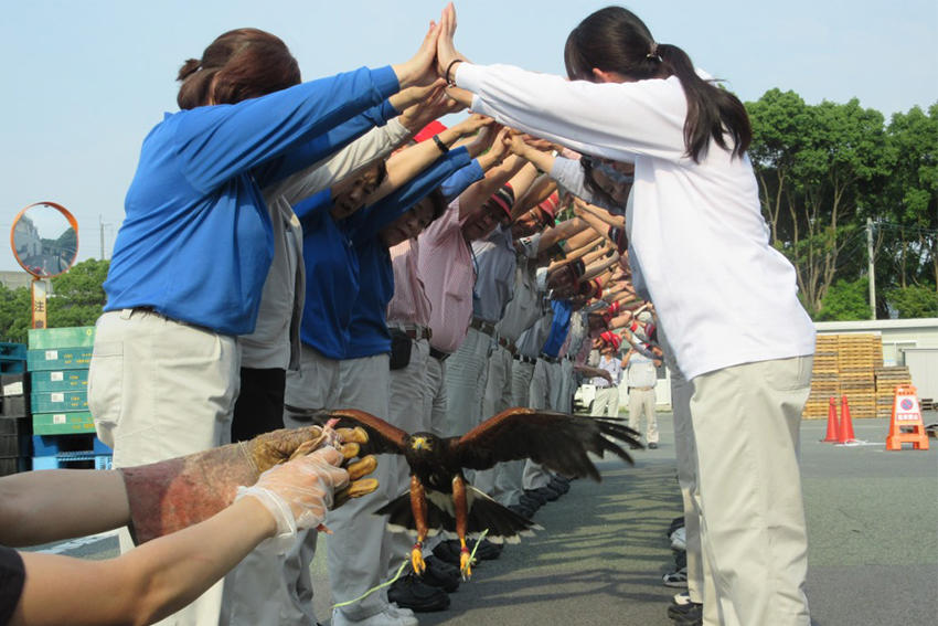 ブリヂストンの熊本工場では、敷地内に迷い込んでしまった野生のハトを敷地の外に帰す目的で、タカによるハトの追い払いを行っています。