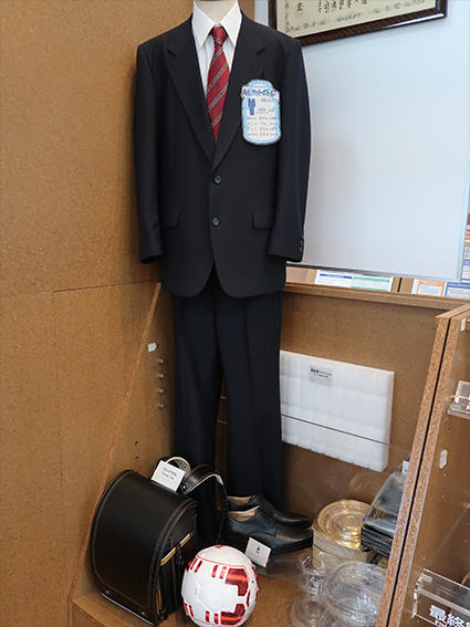例えば、このジャケット、パンツ、シャツ、ネクタイは、すべてペットボトルのリサイクル製品です。さらに下に置いてある靴、ランドセル、サッカーボールも!リサイクルの力でここまでできるなんて驚きですね。