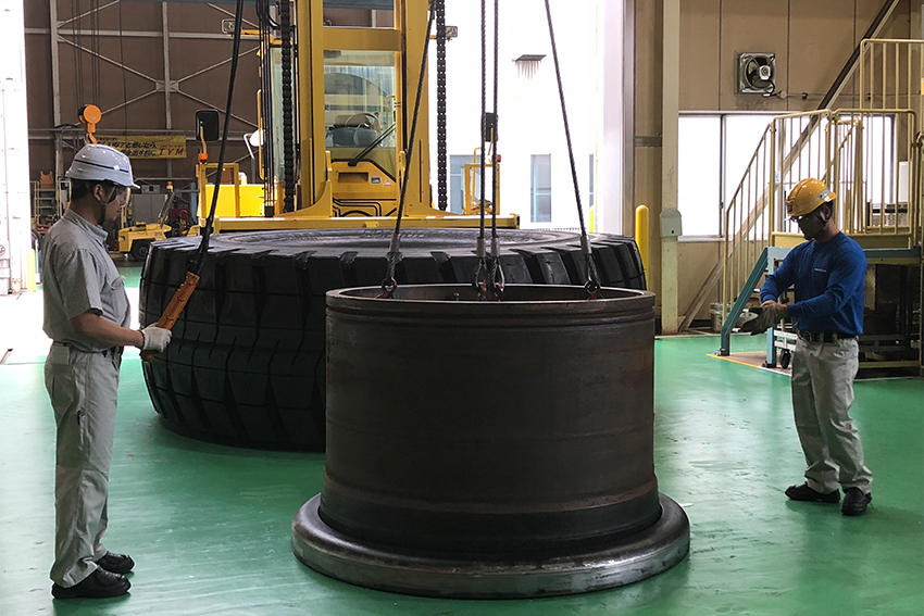 タイヤはホイールに取り付けて空気を入れないと使えません。試験は昔のお風呂の釜のようなホイール(リム)にタイヤを組み付けることから始まります。ORタイヤのリムは、重いものは8トンもあり力自慢の村田社員も持ち上げることができないため、クレーンを使って所定の場所に設置します。下川社員との絶妙なコンビネーションが光ります。